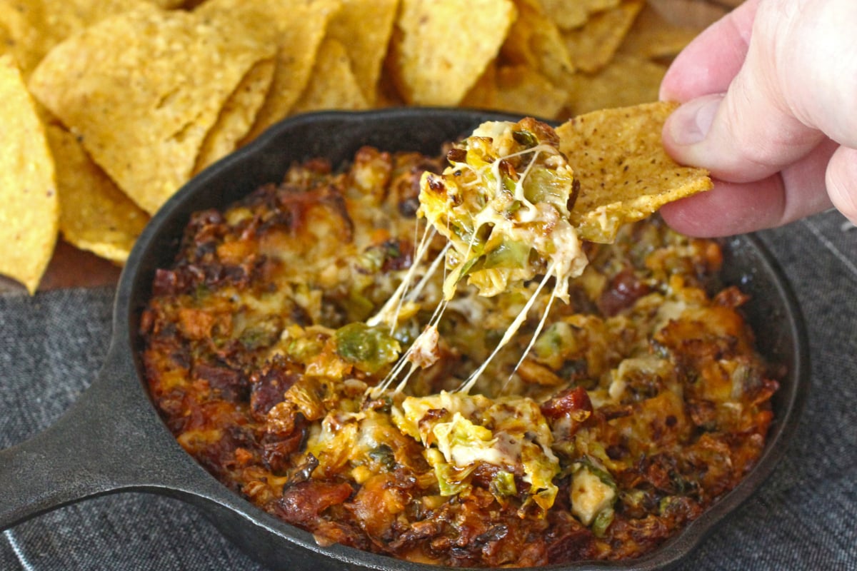 Put the hot plate of cheesy brussel sprout and chorizo dip down on a towel or trivet and put out a bunch of tortilla chips for dipping!