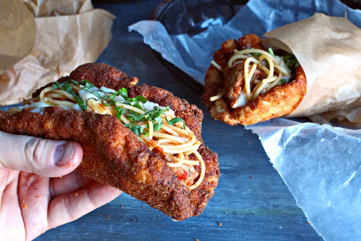A totally new way of eating everyones favorite Italian American dish, this chicken parm shell taco uses the chicken as a vessel to shovel the pasta and meatballs right into your face! These are the flavors you know and love- crispy chicken, savory meatballs and pasta, parmesan cheese and so much tomato sauce. All inside a handheld package! A package of chicken!