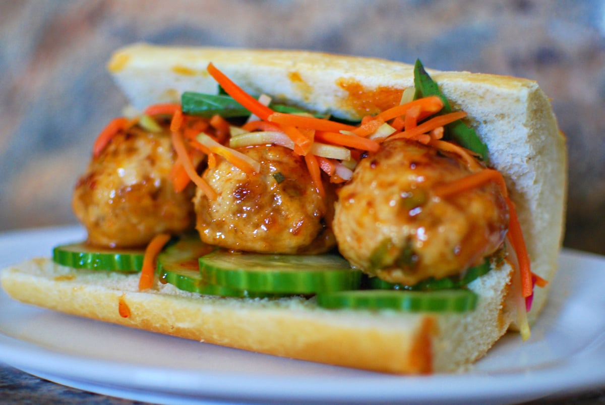 Juicy meatballs with loaded with ginger and tossed in a sweet caramel glaze are the star of this incredible Ginger Chicken Meatball Sandwich! I was inspired by a banh mi, which is why I added pickled carrots and cucumber. It’s also the main reason I tossed the meatballs in that sticky fish sauce caramel. The meatballs were already good, but the caramel sauce cranked the goodness to a whole new level.